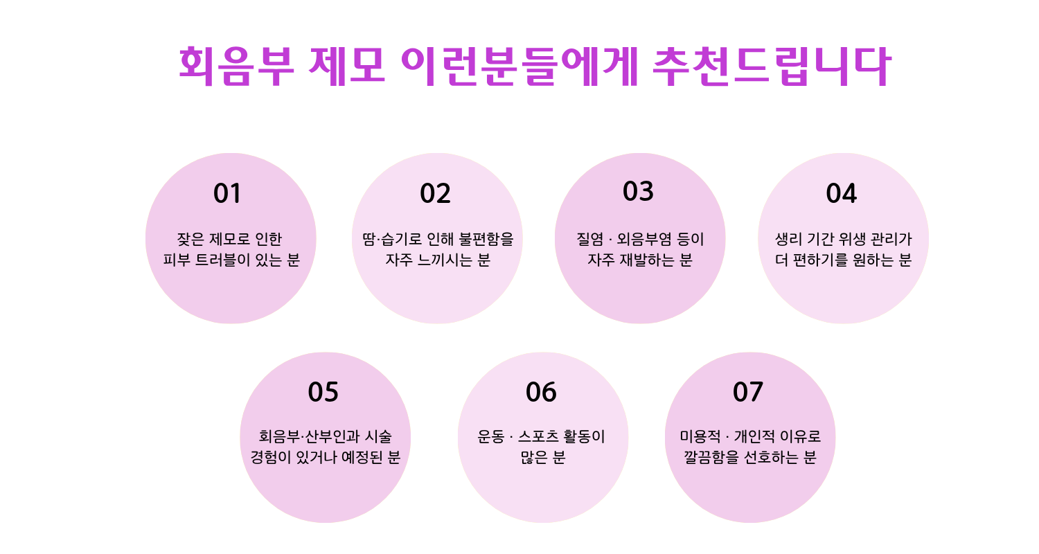 이렇게 반복되는 자가제모가 번거롭고 귀찮은 분들에게 레이저 제모가 권장됩니다.